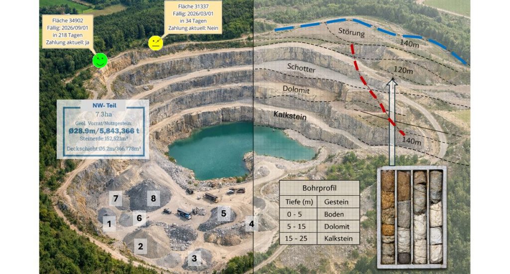 Typische Anwendungen sind Betriebspläne, Bohrdaten, geologische Schnitte, Vorrats- und Massenberechnungen sowie Abbauplanungen, aber auch Liegenschaften, Genehmigungsunterlagen, Fristenmanagement und die Dokumentation von Entnahmemengen.